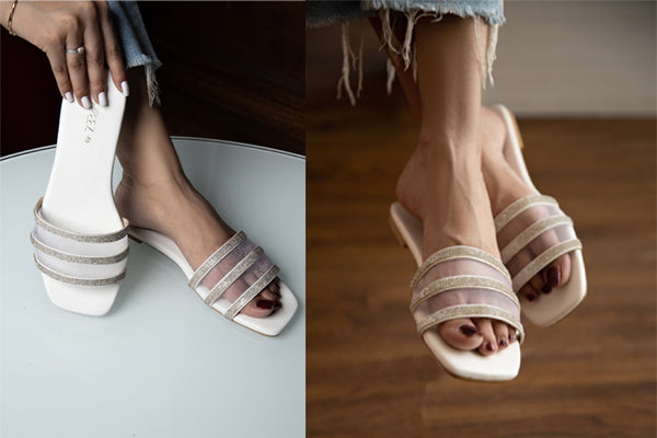 Elegant White Flats with Netted Gem Strap – Perfect Fancy Summer Chappal